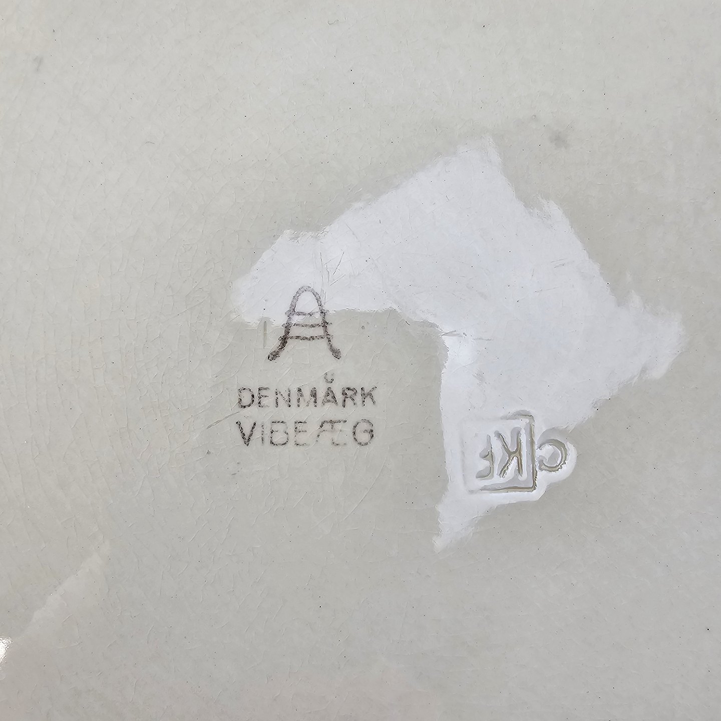 Fajancestel i stelform Viktoria II (Fletværk) med flettet kant og dekoration af en vibeæg blomst i violet og grøn, fremstillet i perioden 1934-1967