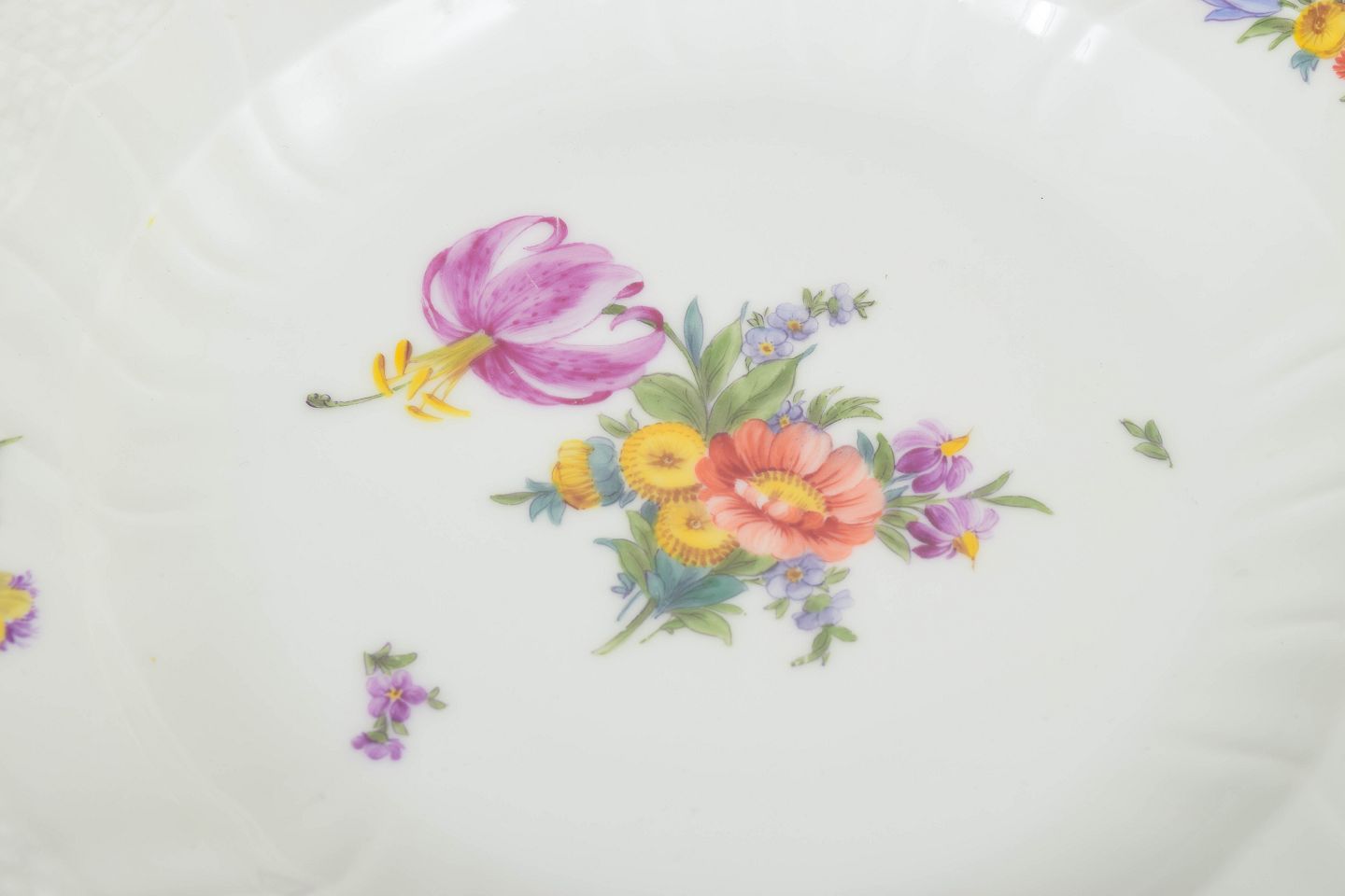 Elegant sæt af fire middagstallerkner i porcelæn dekoreret med håndmalede blomster i saksisk blomst-mønster og afsluttet med forgyldt kant. Model 4/1621. 1. sortering.