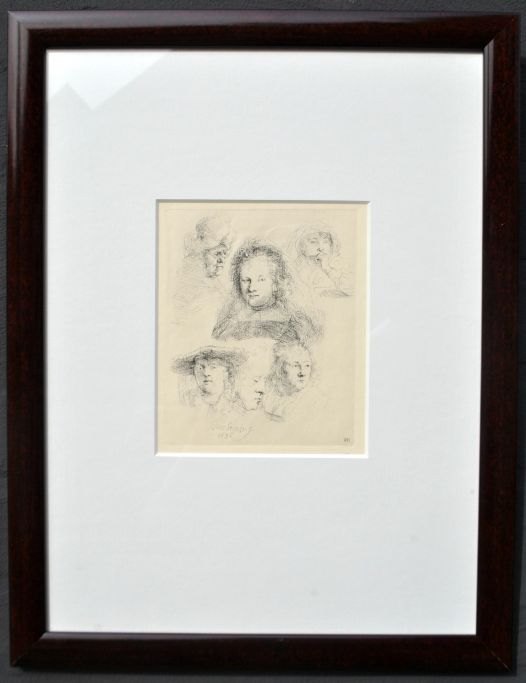 Rembrandt van Rijn (1606 - 1669) Holland: Studieblad med seks hoveder, bl.a. portræt af Saskia, nyere genoptryk. Radering. Signeret. H: 15,5 cm. B: 13 cm.
