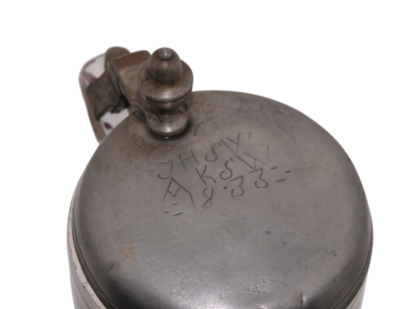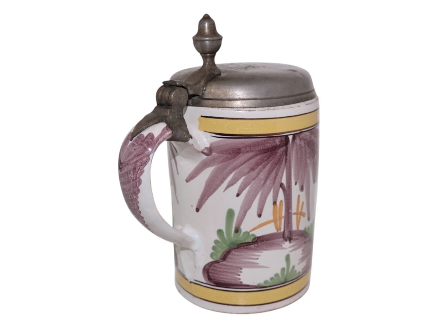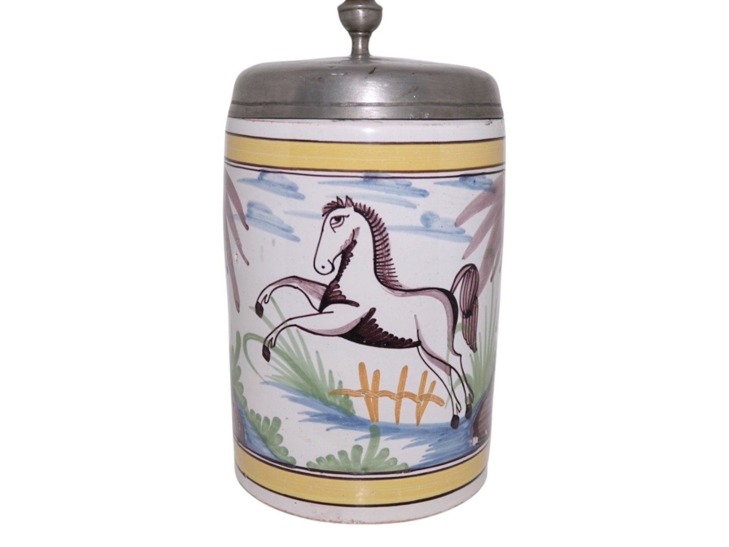 Stort fajance krus dekoreret med en hest. Der er et tinlåg der har senere inskription fra 1833. Kruset er fremstillet mellem 1790 og 1810.