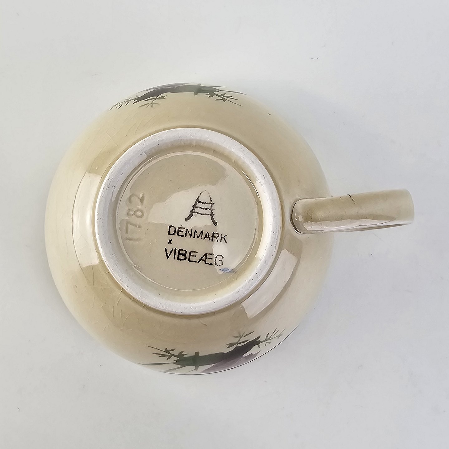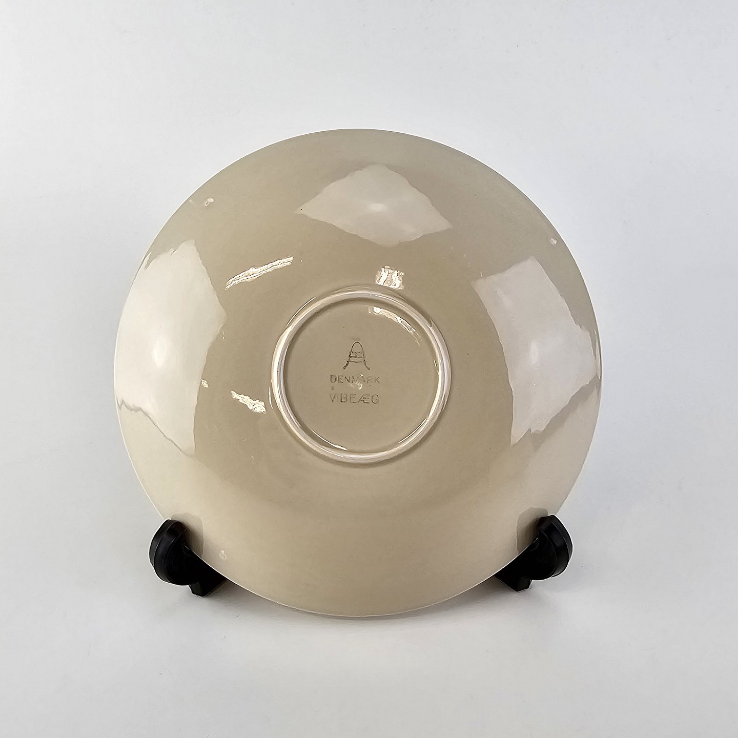 Fajancestel i stelform Viktoria II (Fletværk) med flettet kant og dekoration af en vibeæg blomst i violet og grøn, fremstillet i perioden 1934-1967