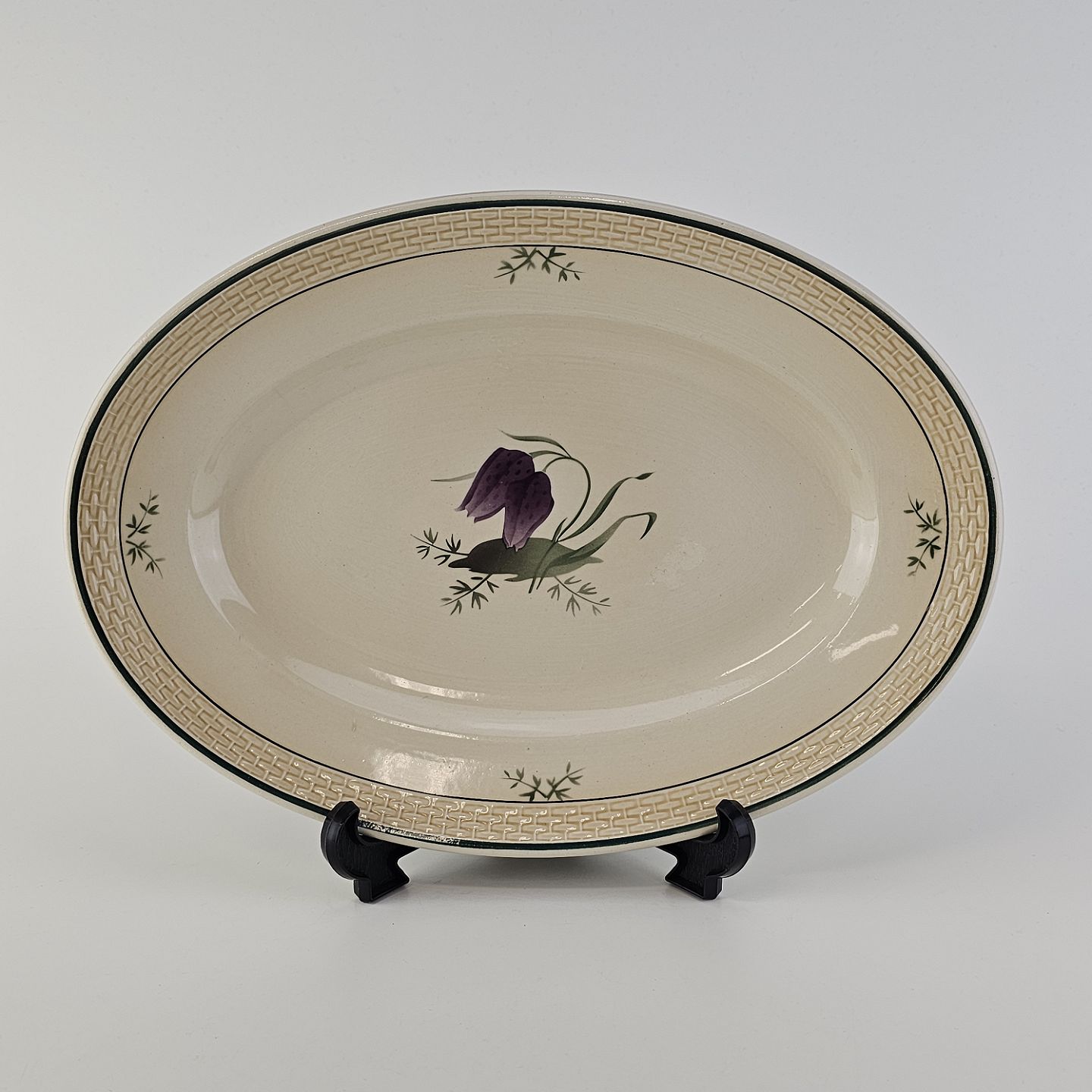Fajancestel i stelform Viktoria II (Fletværk) med flettet kant og dekoration af en vibeæg blomst i violet og grøn, fremstillet i perioden 1934-1967