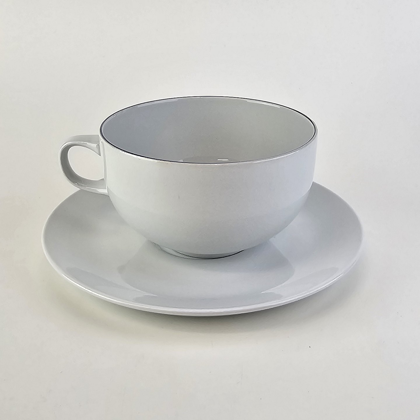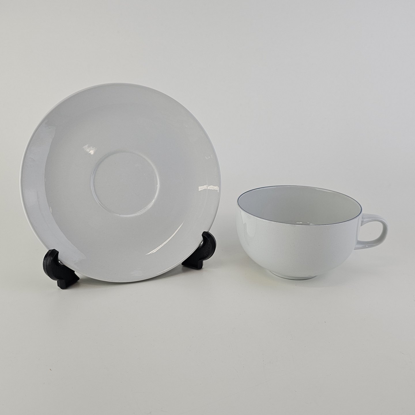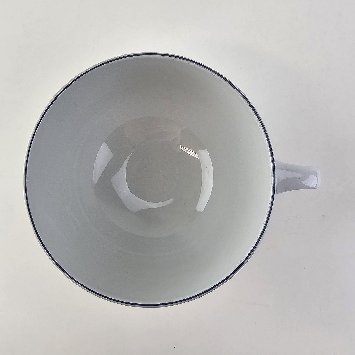 Blåkant er stel i hvid fajance med dekoration af en blå streg på kanten