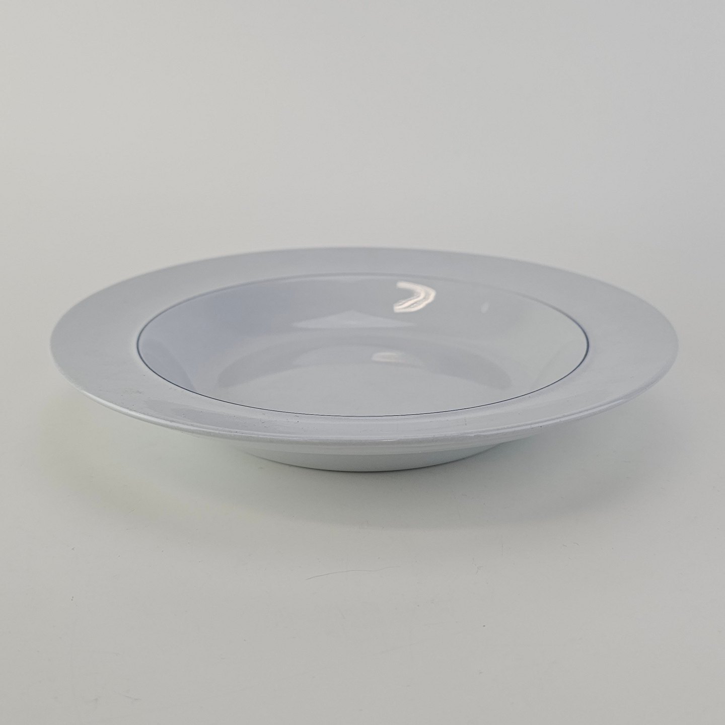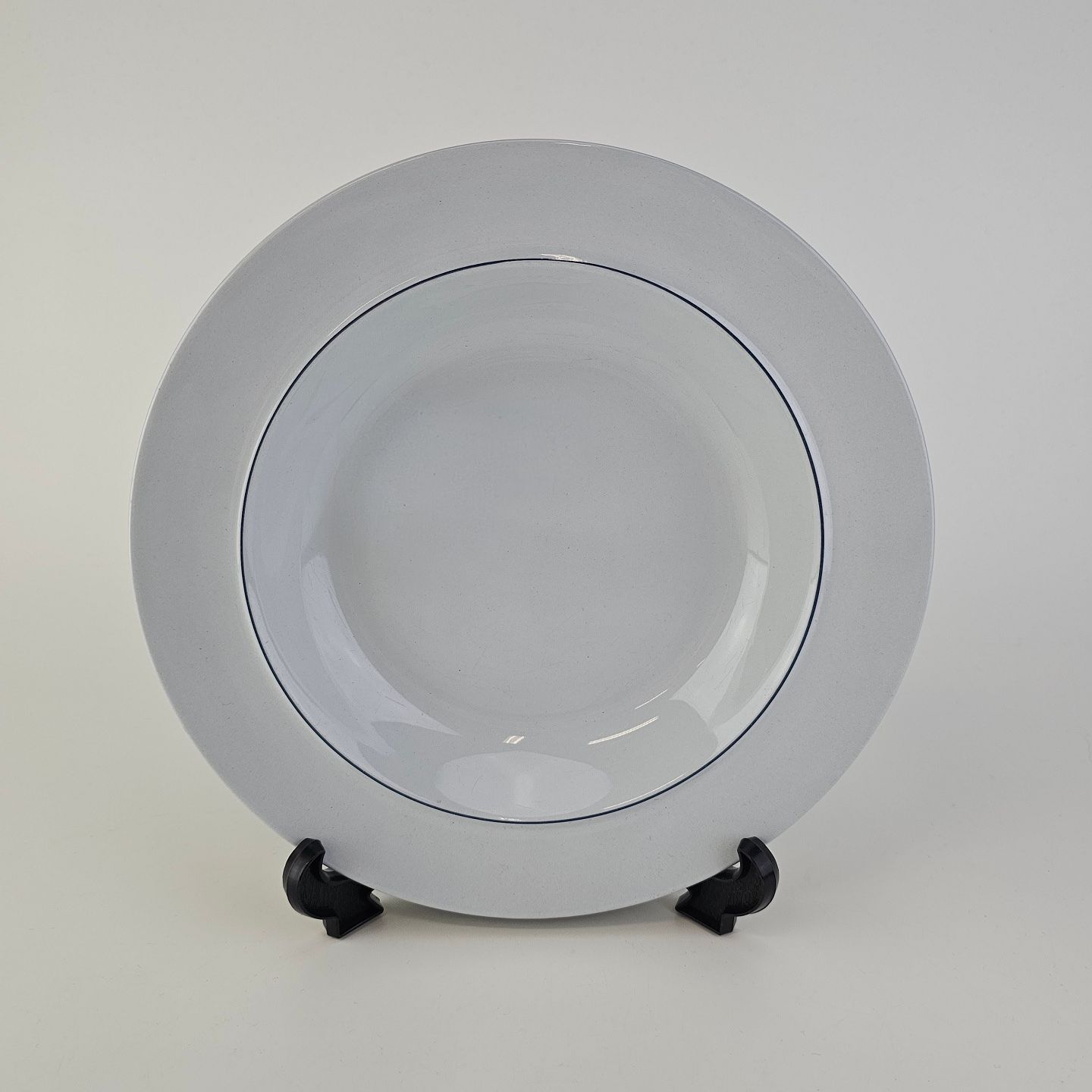 Blåkant er stel i hvid fajance med dekoration af en blå streg på kanten