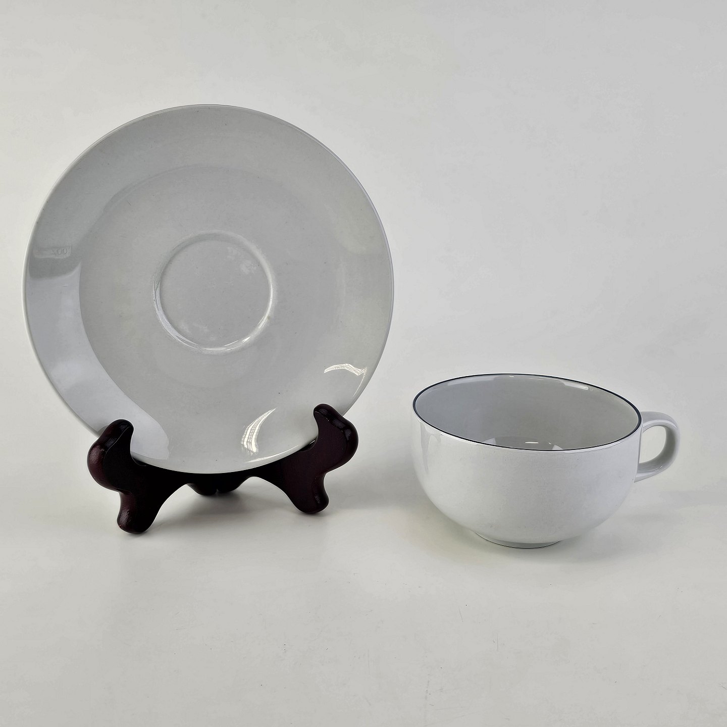 Blåkant er stel i hvid fajance med dekoration af en blå streg på kanten