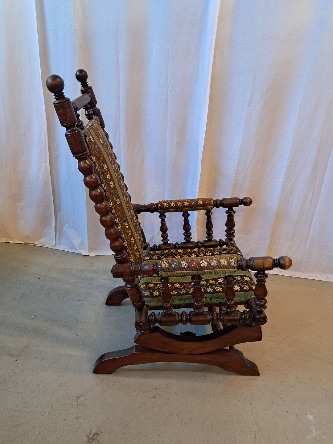 Rokkestol i massivt egetræ med broderet betræk, fra 1940erne.