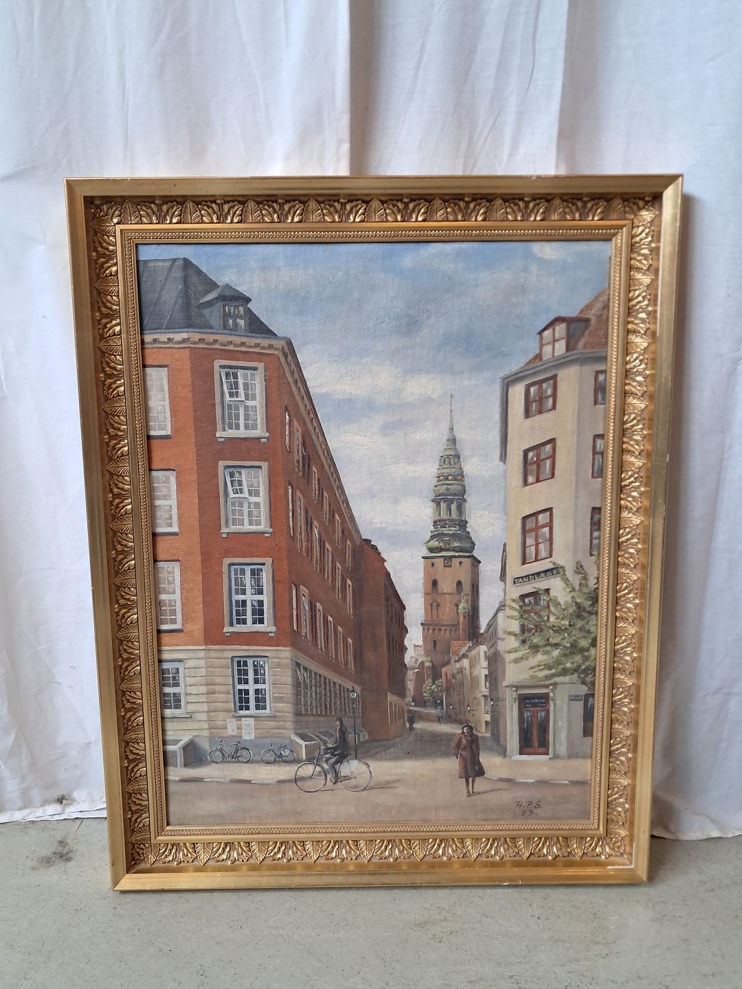 Maleri af Nikolaj kirke i guldmalet ramme, fra 1950erne.