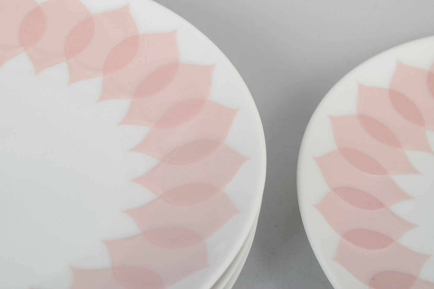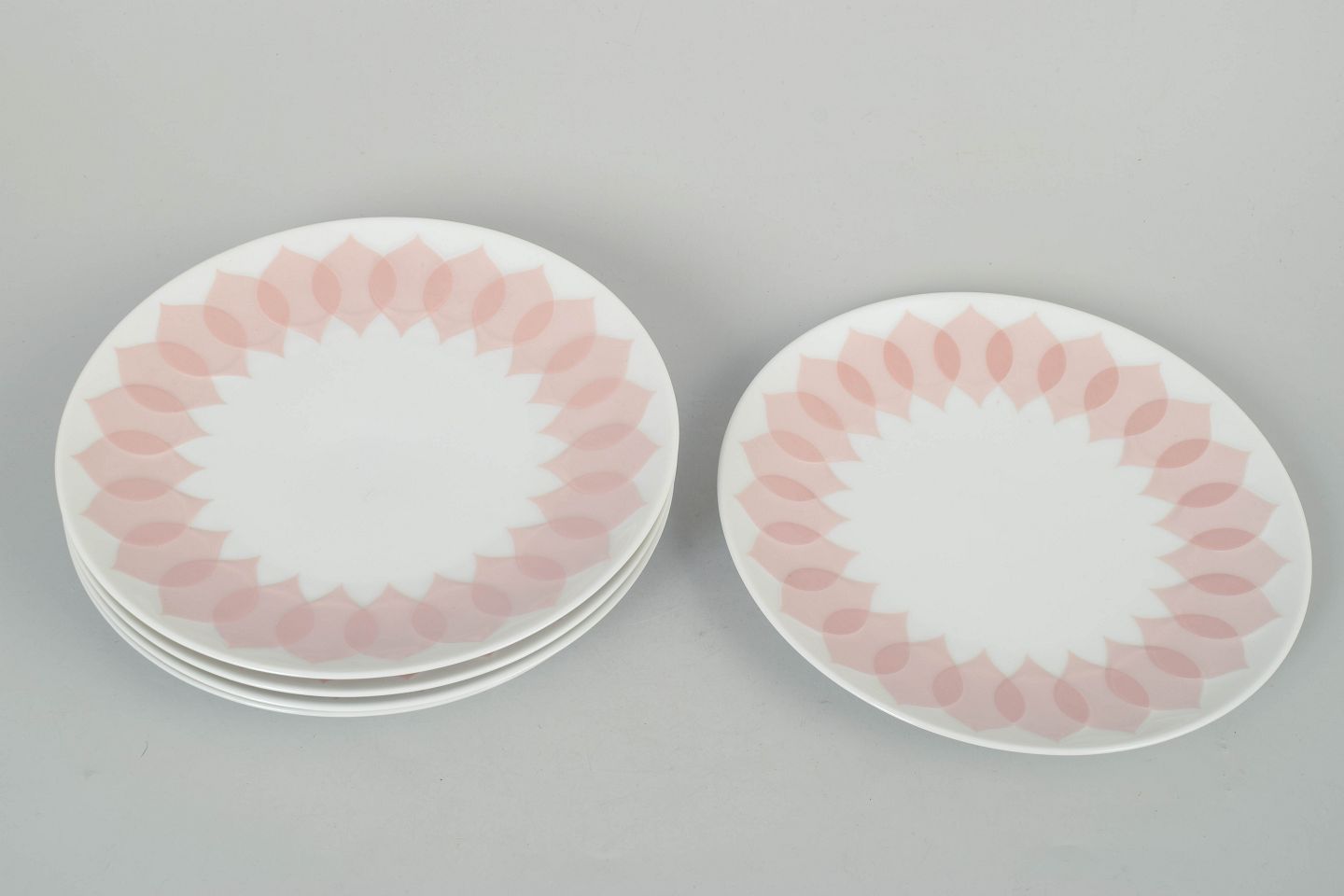 Fem tallerkener i porcelæn med rosa “Lotus” dekoration, udført med gentaget bladmotiv langs kanten i bløde nuancer og et karakteristisk dekorativt udtryk.