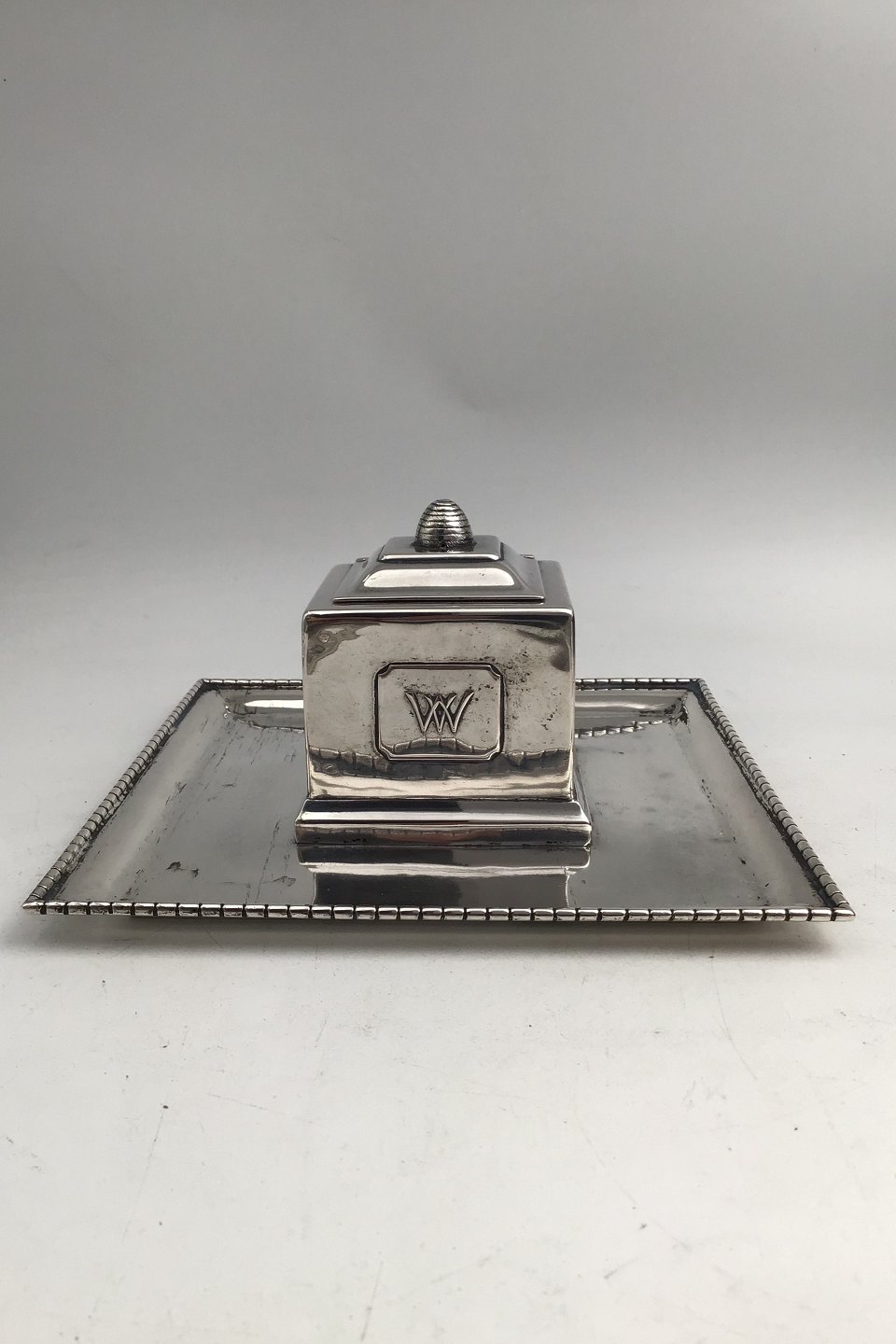 Mogens Ballin Eftf. Sølv Blækhus No. 144 Måler 18 cm x 18 cm (7.08 inch x 7.08 inch) H 9 cm (3.54 inch) Vægt 518 gram / 18.27 oz (uden glas indsats) Bærer Monogram for Wessel&Vett, stiftere af stormagasinet Magasin