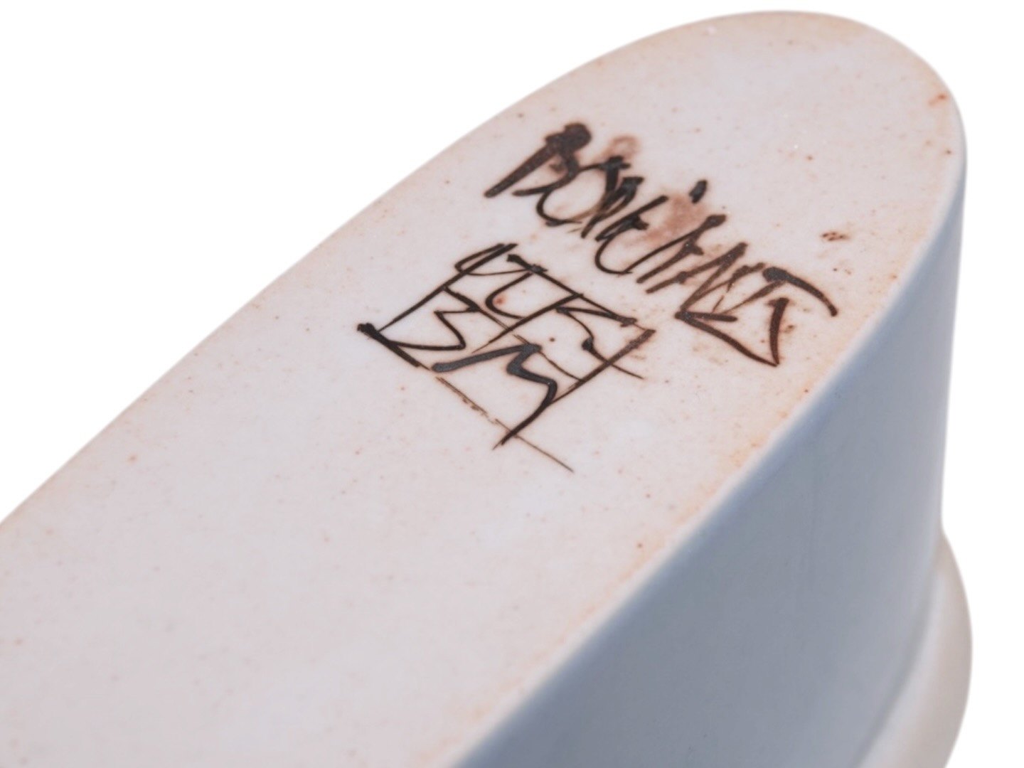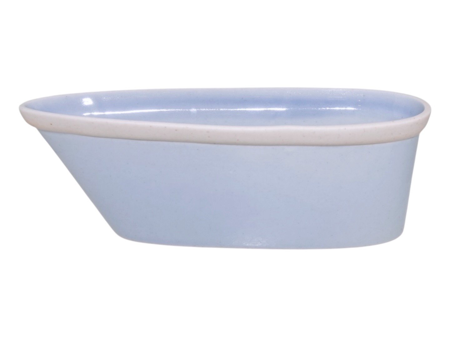 Bodil Manz keramik, bådformet lyseblå skål med hvid stribe.
