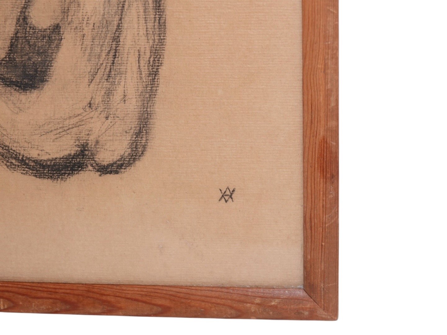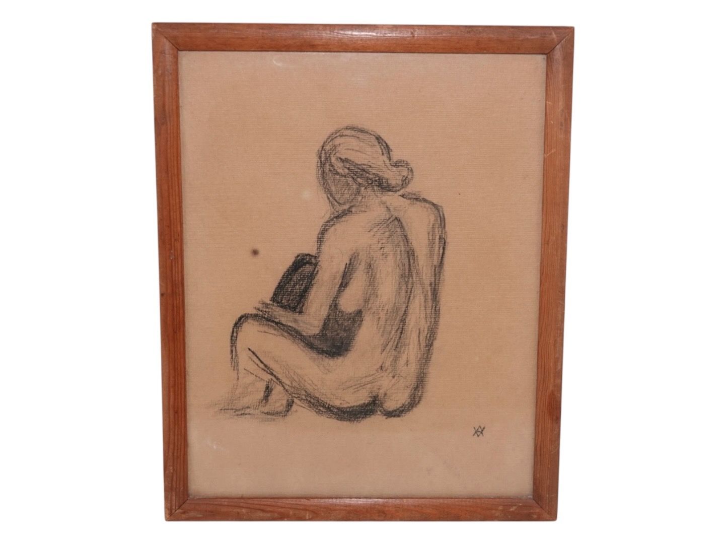 Vibeke Alfelt (1934-1999), tidlig tegning af nøgen dame i træramme og bag glas.