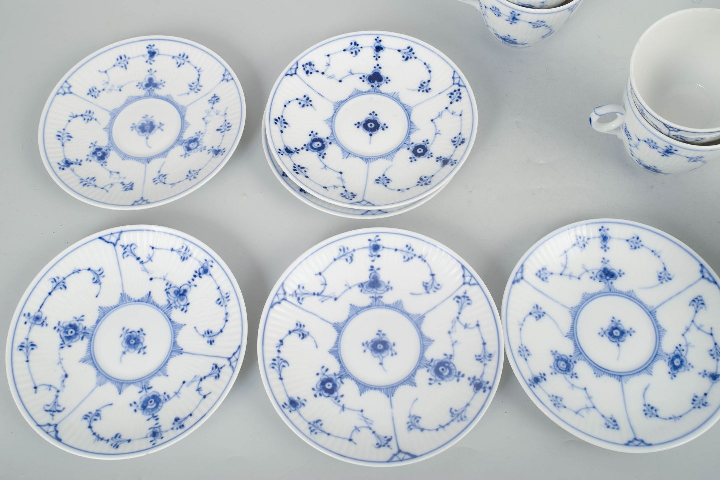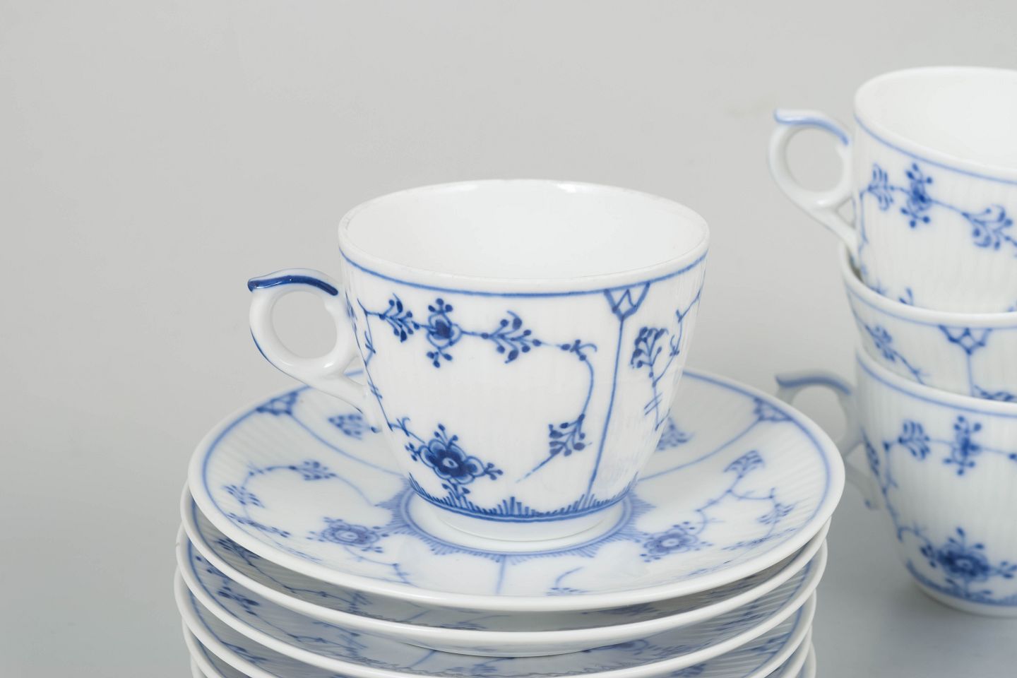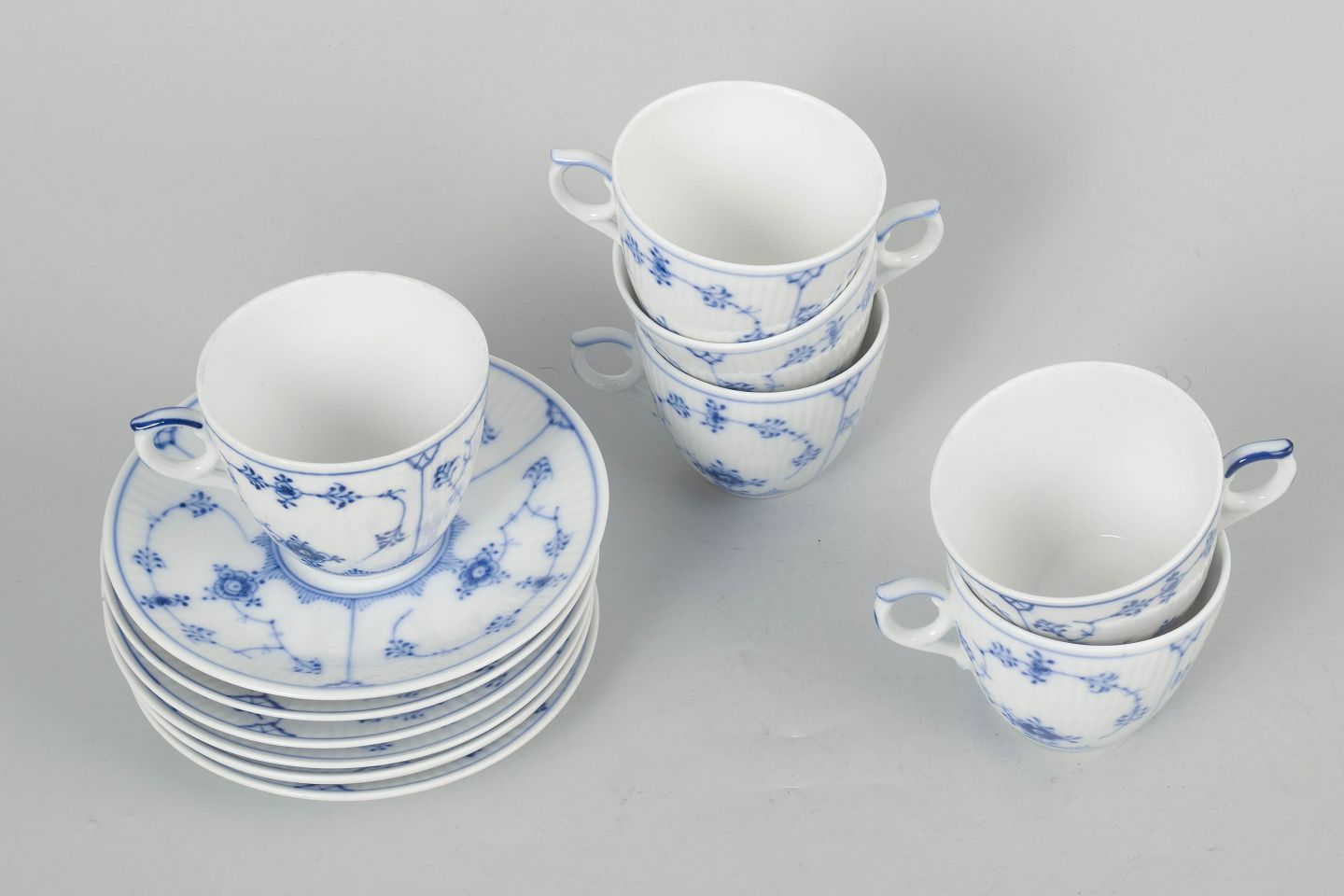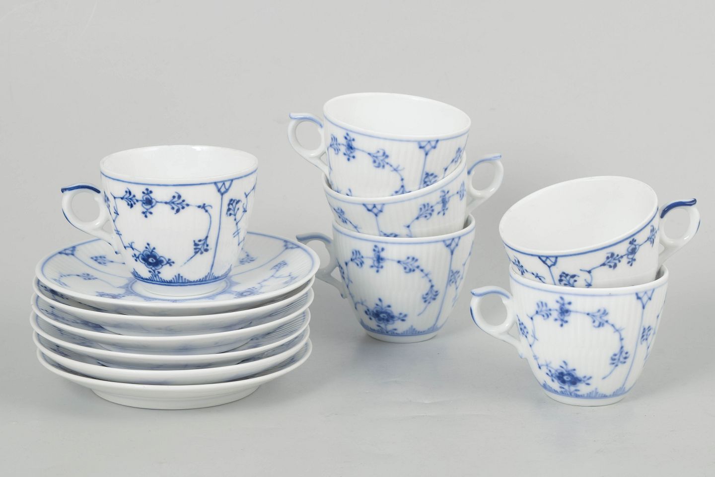 Royal Copenhagen Musselmalet Riflet, sæt af seks kaffekopper med underkopper.