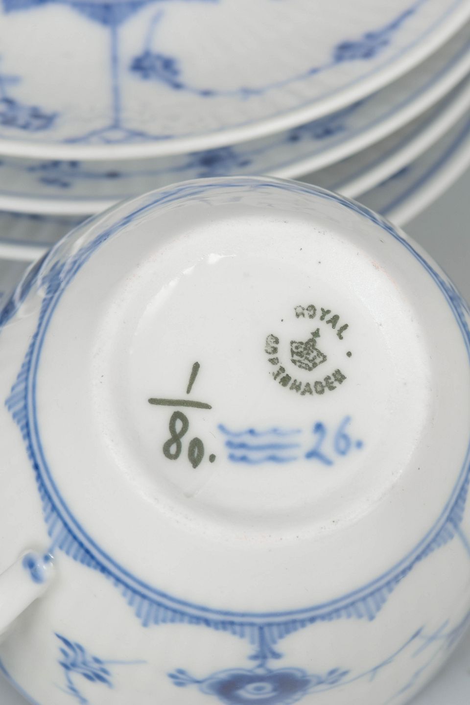 Royal Copenhagen Musselmalet Riflet, sæt af fire kaffekopper med underkopper.