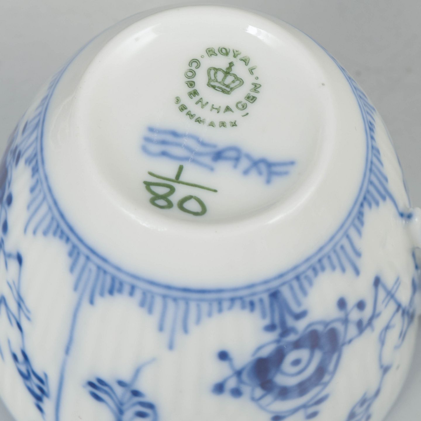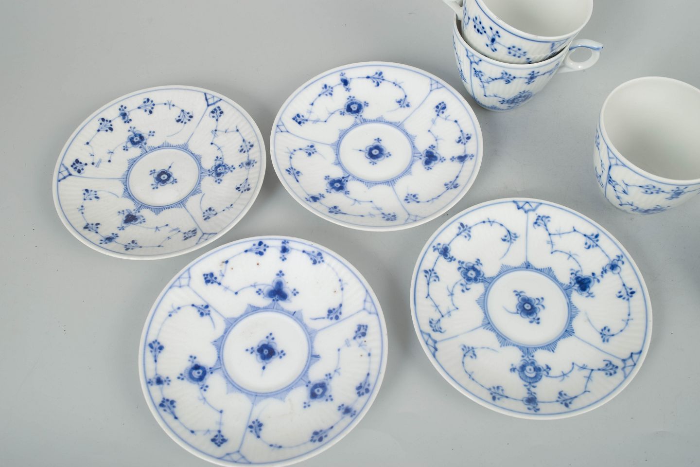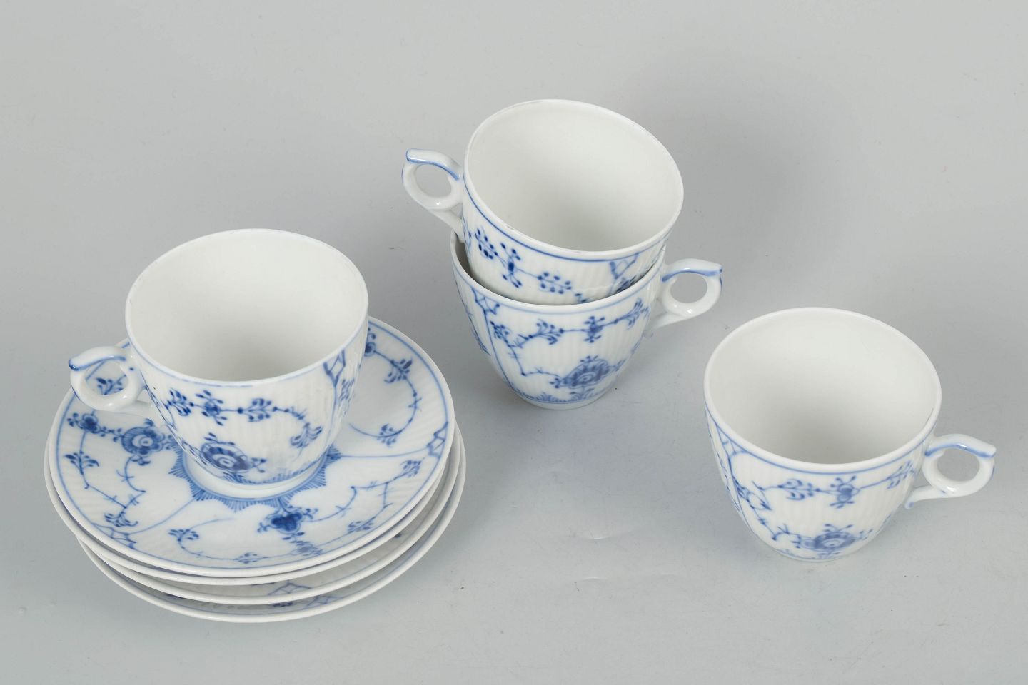 Royal Copenhagen Musselmalet Riflet, sæt af fire kaffekopper med underkopper.