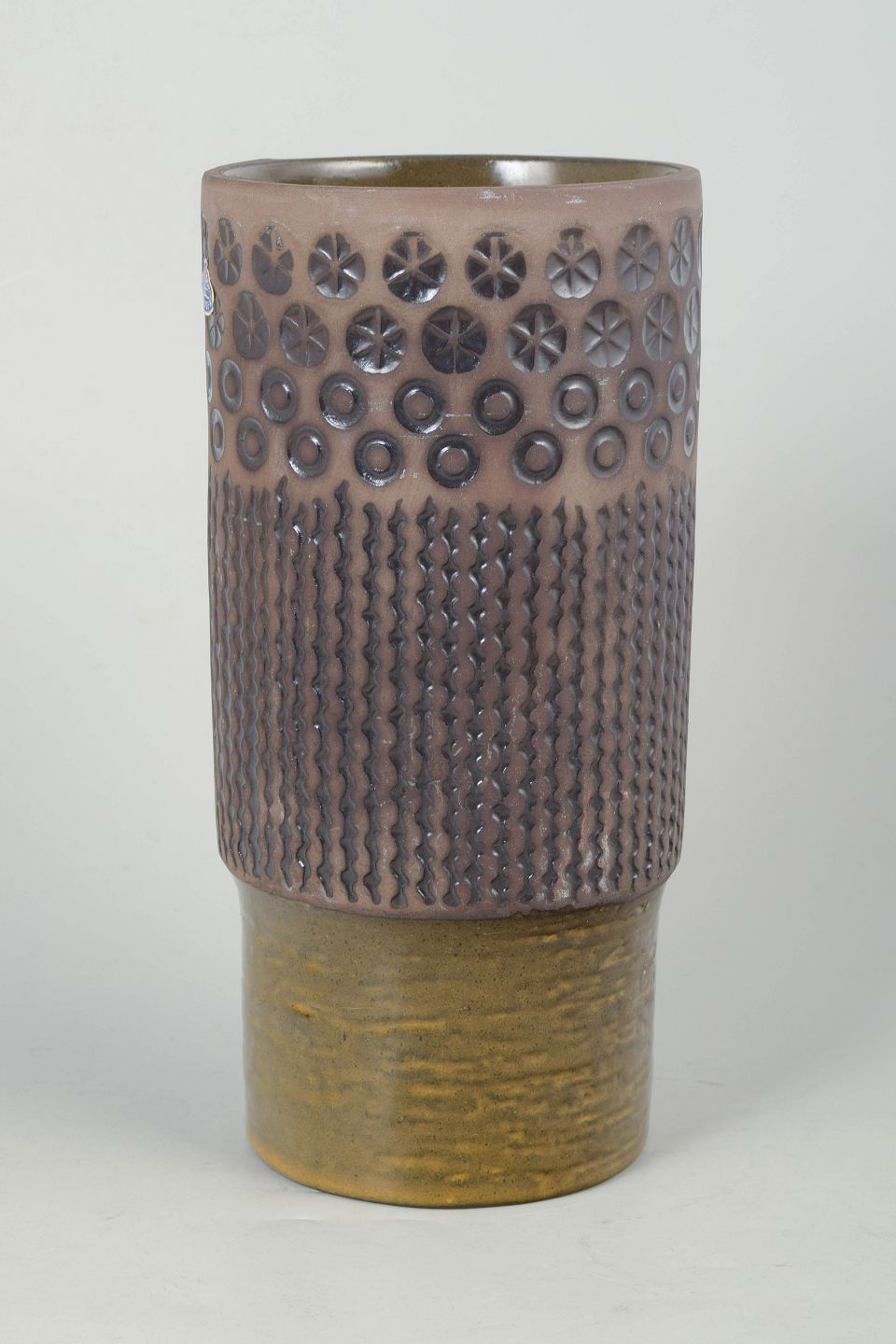 Høj cylindrisk keramikvase model 6074M med reliefdekoreret overflade i geometriske mønstre og håndglaserede nuancer i rosa, grå og olivengrøn.