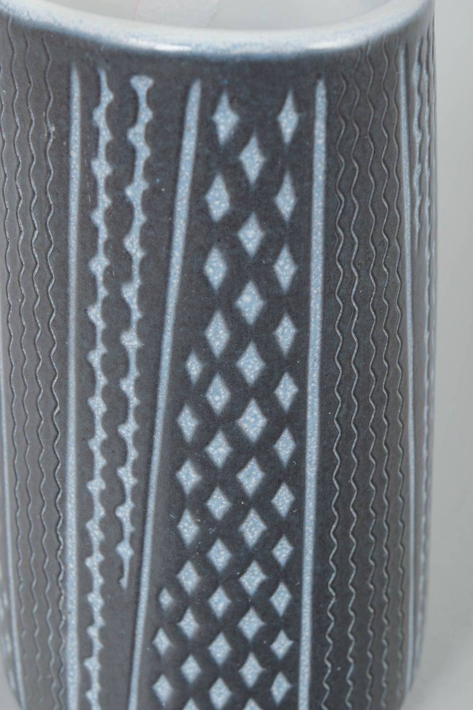 Cylindrisk keramikvase med grafisk dekoration i vertikale mønstre og glaserede nuancer i gråblå og hvid.