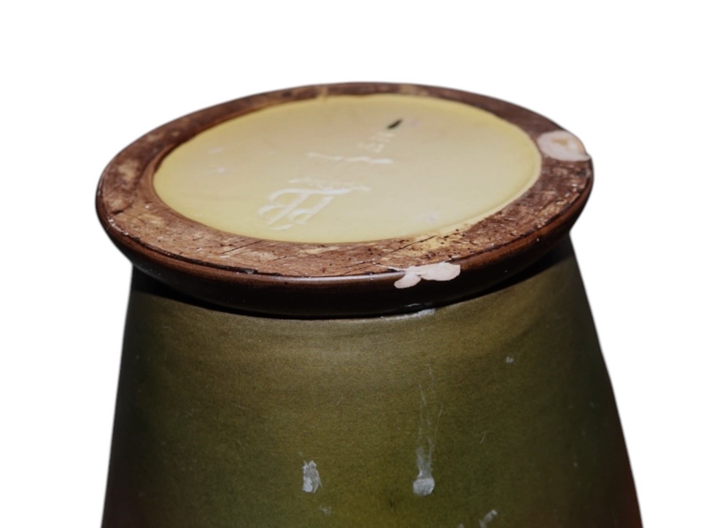 Der er to skår på bundkanten, en lille afskalning i toppen samt en reperation på en drueklase, se fotos.