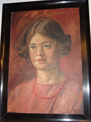 Pige i koralrød bluse, koralkæde og "frikadeller" ved ørerne.