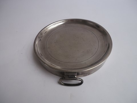 Varmefad af tin m. 2 hanke, England ca. 1880. 3 cm. høj og 21 cm. bred.