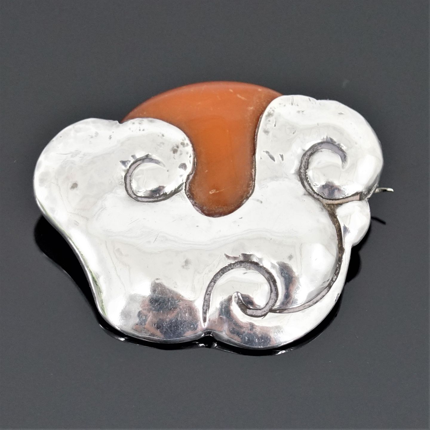 Thorvald Bindesbøll for Holger Kyster; Skønvirke broche af sølv, prydet med rav. H. 3,2 cm. B. 4 cm.