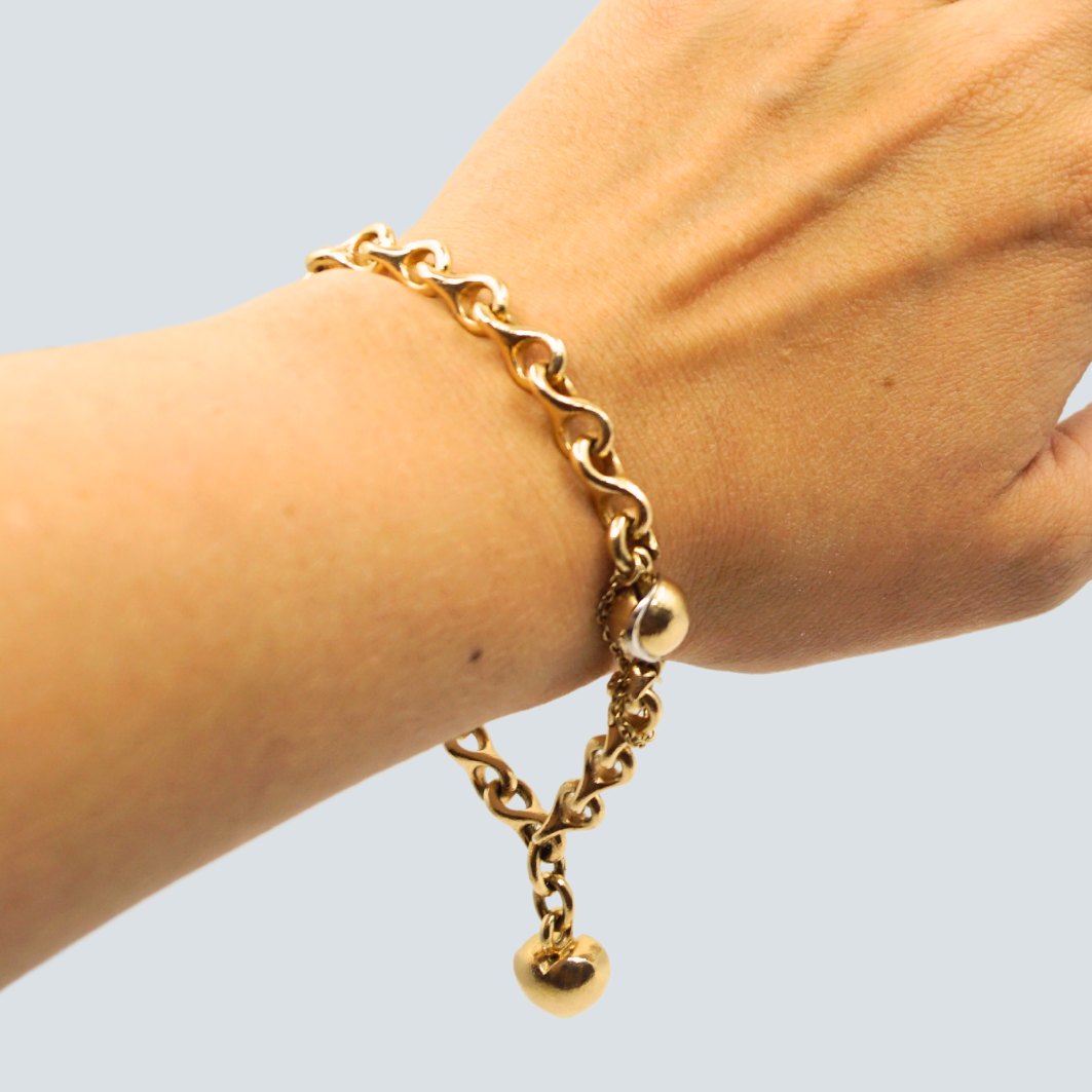 Ole Lynggaard; Otte-tals armbånd i 14 kt. guld med smilet kuglelås og hjertevedhæng