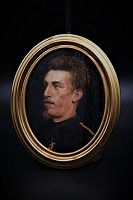 Old oval oil portrait painting of young man painted on wood, framed in gold frame. 15,5x12,5cm.