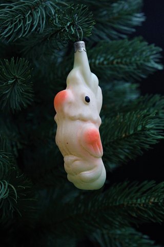 Old Christmas tree ornament in the shape of a little angel playing a trumpet in pearly white plastic from the 50s. Length 8cm.