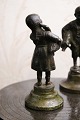 2 small decorative bronze figures of a boy with 2 pigs under his arm and a girl holding a goose. H: 12.5cm. & 11.5cm. Only sold together !