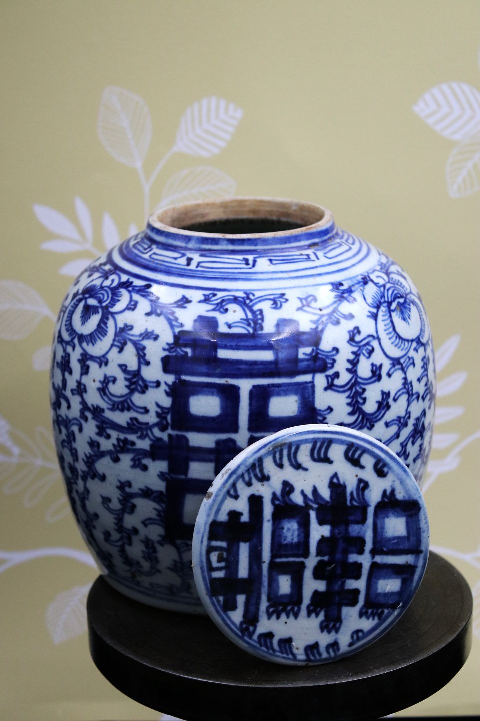 Old Chinese ginger jar in glazed stoneware in a fine blue color. H: 19.5cm. Dia.: 19cm. Item number: kinesisk ingefær krukke