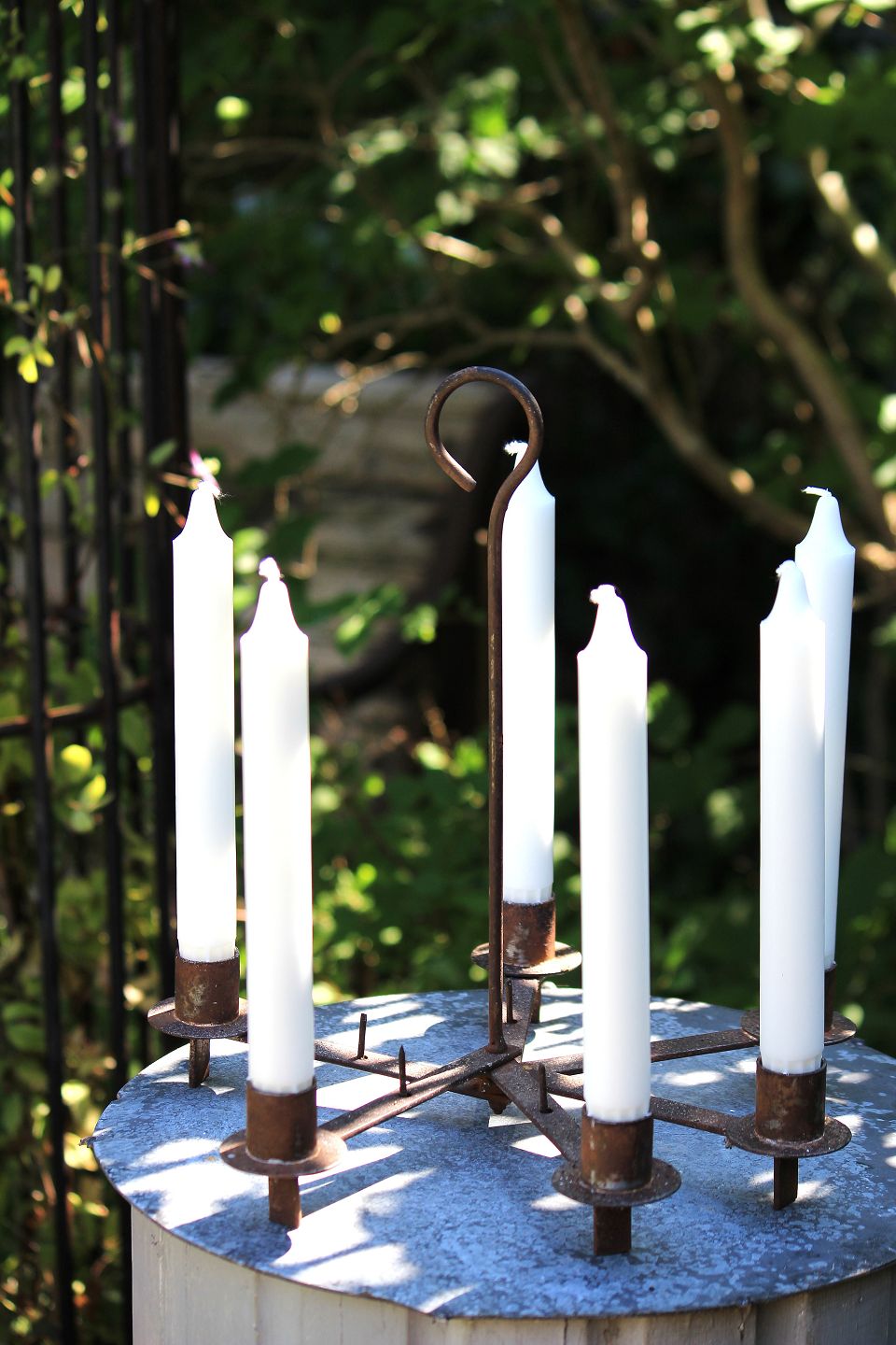 Gammel svensk lysestage i smedejern til 6 stearinlys som både kan stå på bord eller hænges ned fra loft. (gammelt tov til ophæng følger med)