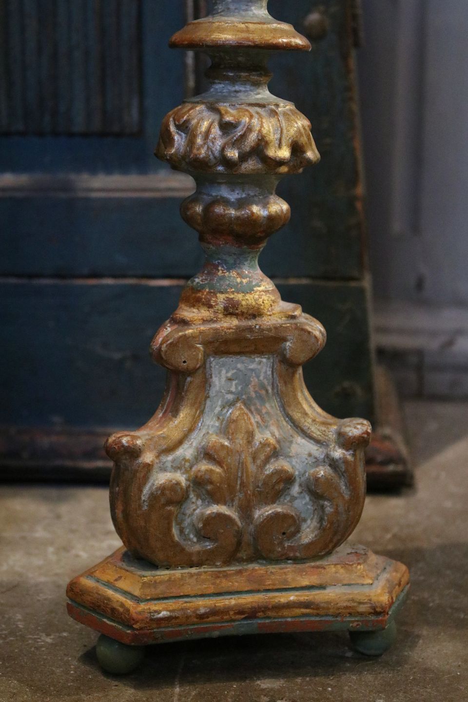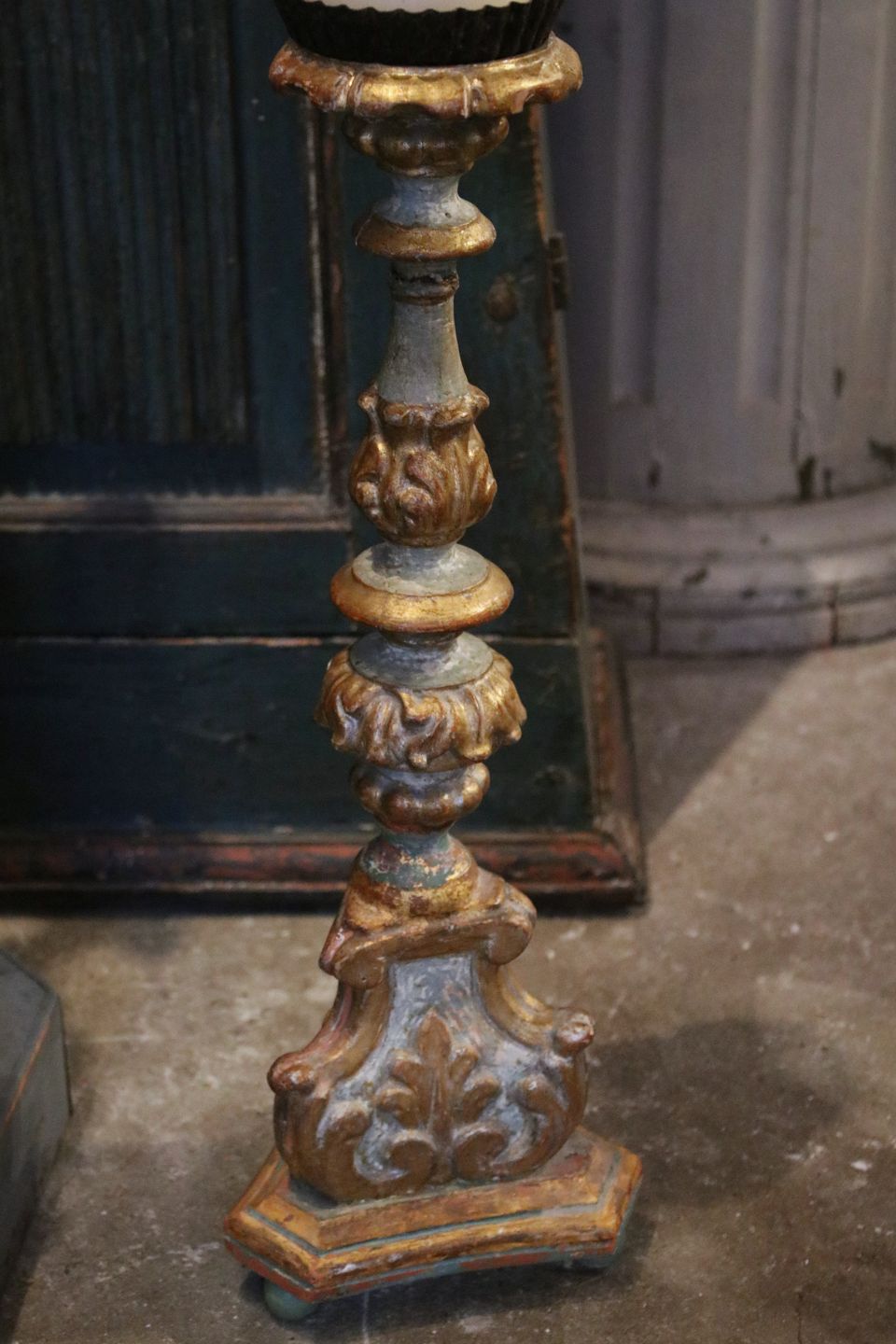 Antik , fransk 1800 tals lysestage i udskåret træ med original bemaling og med en rigtig fin patina. Højde: 44cm.