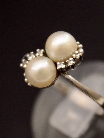 18kt hvidguldsring med perle flankeret af 18 diamanter hver på ca. 0,015ct. Ringstr. 56