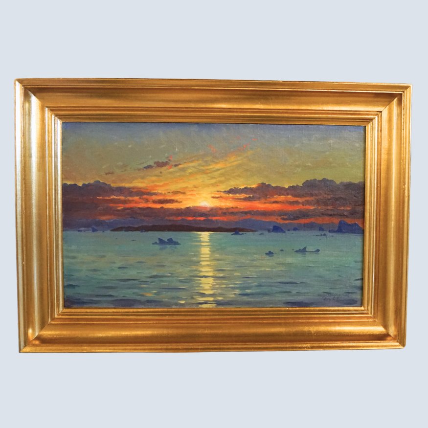 Description: Emanuel A. Petersen Greenlandic oil painting with motif of sunset at Christianshaab / Qasigiannguit