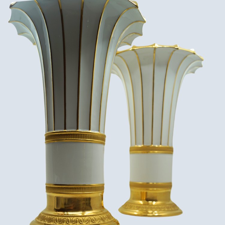 Description: A pair of Royal Copenhagen "Hetsch" vases no. 740/8569 with gold painting, in very fine condition. The vase was designed by Gustav Friederich Hetsch (1788-1864) who was artistic director of Royal Copenhagen in the period 1828-1864. Both vases are in first sort. and in perfect condition.