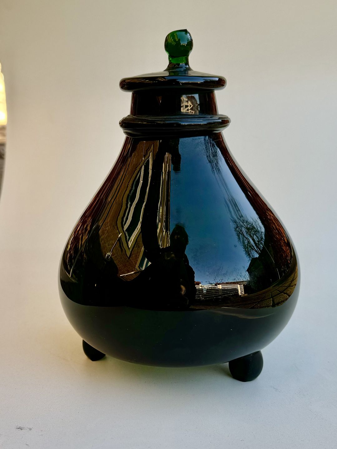 Description: Fluefanger i grønt med med prop. Fremstillet i kraftigt grønt flaskefarvet glas. Stående på tre fødder. Brugsspor på toppen, hvor der også ses et skår. Ellers i god stand. Fremstillet i Danmark i 1800-tallet. Hhv. 16,5 og 19,5 cm høj.