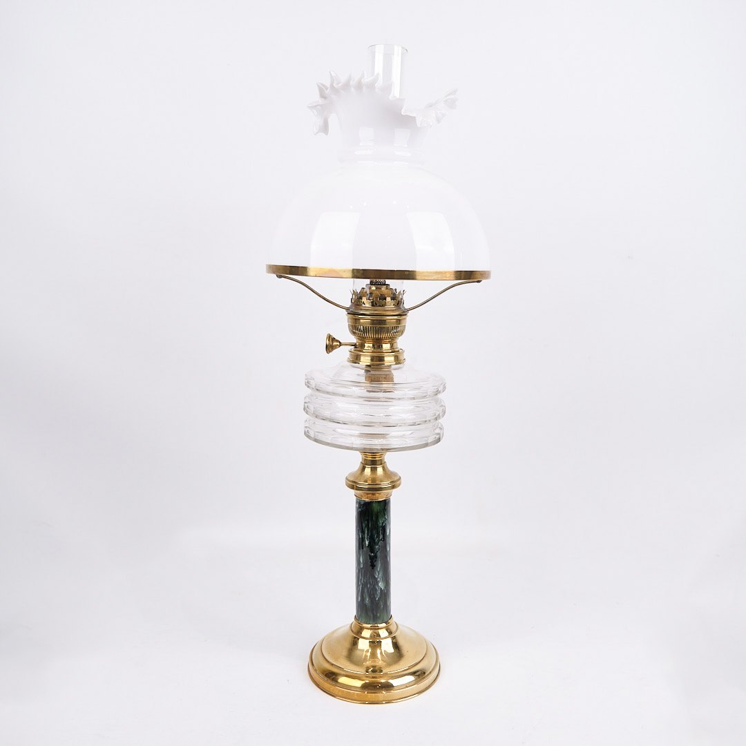 Description: Antique kerosene lamp from the 1880s, manufactured by Fynsk Glasværk. The lamp is made of brass with a marbled base and a white dome in opal glass, which gives a soft and atmospheric light.