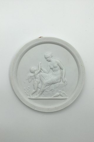 Beskrivelse: Royal Copenhagen Biscuit Platte Amor klager til Venus over stikket af en bi No 84. Kopi af O.H.B. Olrik fra 1849 after Thorvaldsens original fra Rom 1809. Mindre overfladeskår nederst til venstre. Måler 14 cm.