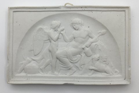 Description: Royal Copenhagen Bisque Plate Amor at Bacchus No 66. Copy from 1847 by Th. Mule after Thorvaldsens original from Rom after 1910. Measures 15cm x 9cm. Has numerous chips, as can be seen on the picture. Four chip on four sides !