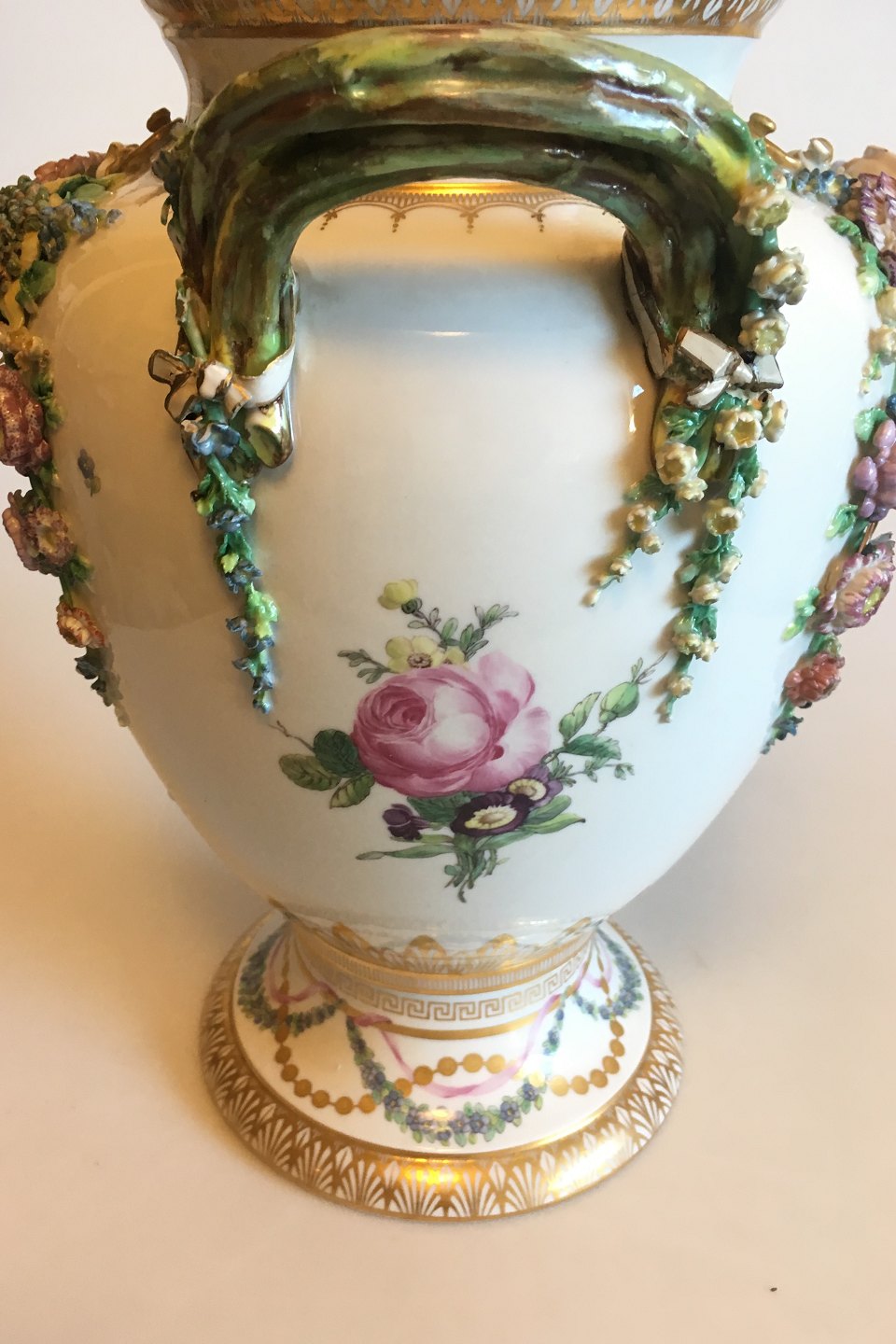 Description: Royal Copenhagen Ormamental Vase with Putti figurine. Measures 50 cm / 19 11/16 in. and is in good condition. Has a few chips on flowers. Repair by handle. Motif is Rosenborg.