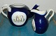 Beskrivelse: Blå tepotte uden låg samt ditto flødekande, begge med personligt (ubekendt) monogram i porcelæn fra Royal Copenhagen. Fremstillet mellem 1840-1860. Begge dele fremstår i god stand uden skader eller reparationer. Flødekanden er 9½ cm høj
