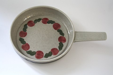 Beskrivelse: Rørstrand, Birgitta. Gråt stoneware med håndmalede blomster og brun kant. Pande. Højde 4,5 cm. Diameter 19,5 cm. Pris: SOLGT