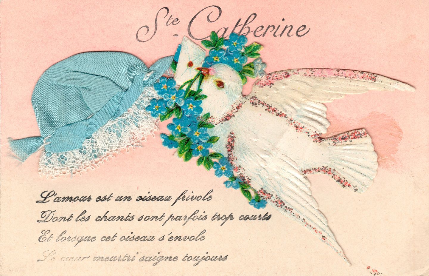 Beskrivelse: 2 Dimensionelt Fransk postkort med due, hat af stof (St.Catherine, Fransk fest dag) 1930'erne. Mål ca. 14 x 9 cm.