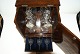 Beskrivelse: Tantalus i egetræskasse med 2 karafler og skuffe til glas med nøgle.