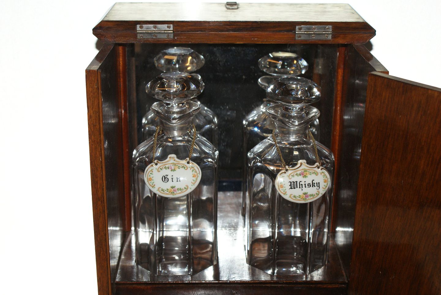 Tantalus i egetræskasse med 2 karafler og skuffe til glas med nøgle.