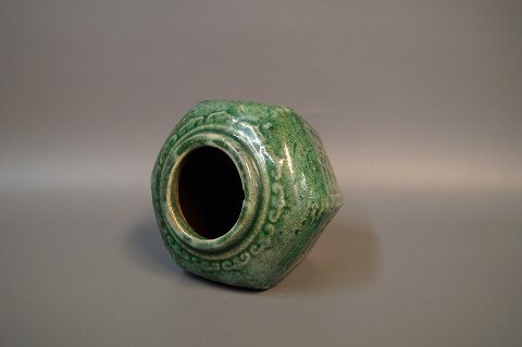 Kantet keramik vase med mørkegrøn glasur fra 1940erne af en ukendt keramiker.