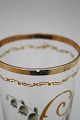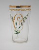 Beskrivelse: Fyens Glasværk, Vandglas med guldbelagt rand, samt emaljemalet stort "C" med liljekonvaller og bort under randen. Fremstillet i 1903. Lille afslag i guldkanten. Højde: 11,8 cm. Diameter: 6,8 cm. Pris:
