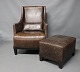 Description: A pair of easy chairs in dark Brown leather with stools from the Italian brand Smania.