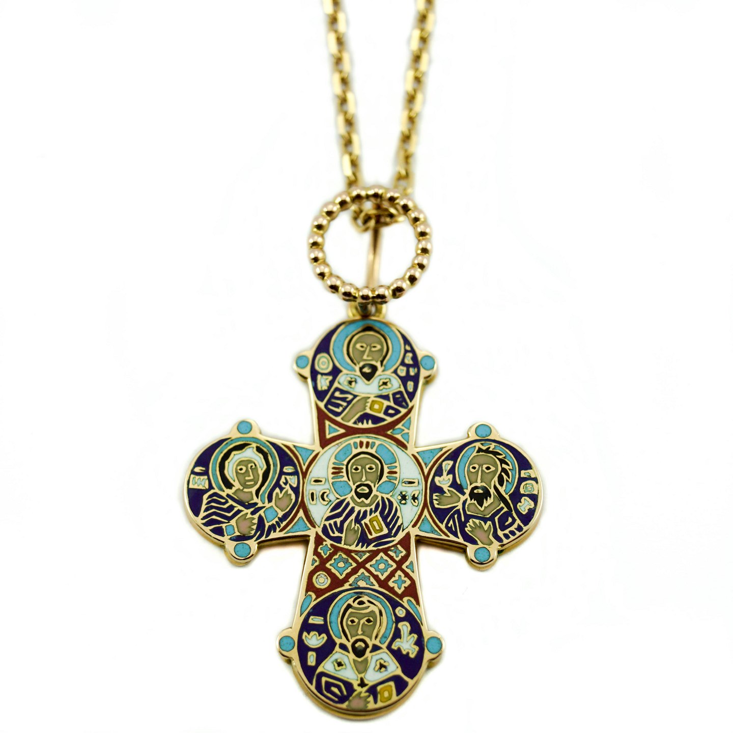 Description: Crucifix of 14 carat gold adorned with enamel. H. 3.8 cm. B. 3.1 cm.