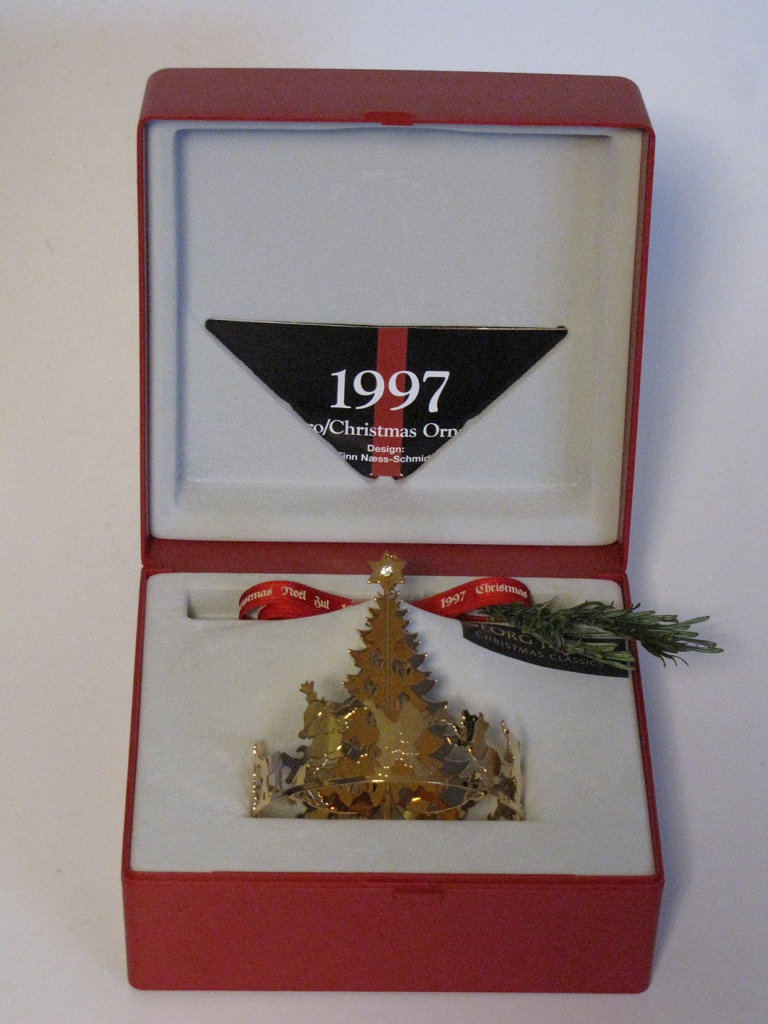Beskrivelse: Julepynt i forgyldt messing med 24-karat guld fra Georg Jensen. Juleuro fra år 1997 i original æske, med originalt bånd og hæfte.