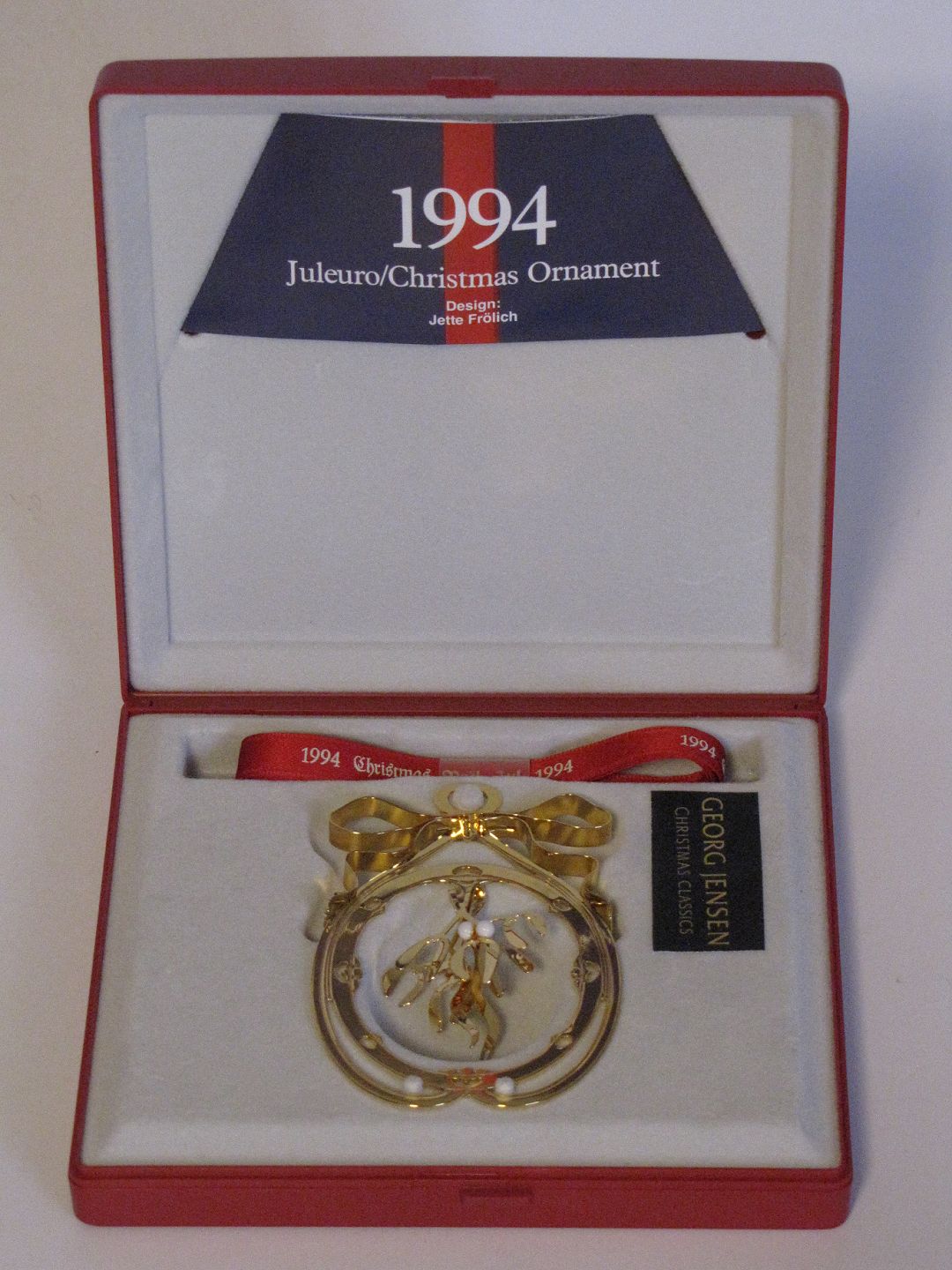 Beskrivelse: Julepynt i forgyldt messing med 24-karat guld fra Georg Jensen. Juleuro fra år 1994 i original æske, med originalt bånd og hæfte.